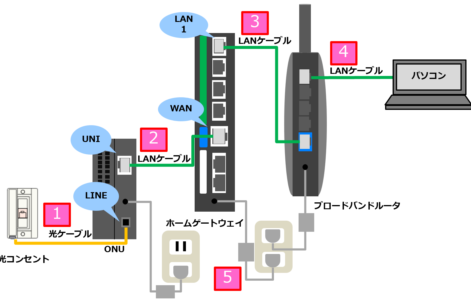 - ONUの「UNIポート」とホームゲートウェイの「WANポート」をLANケーブルで接続します。